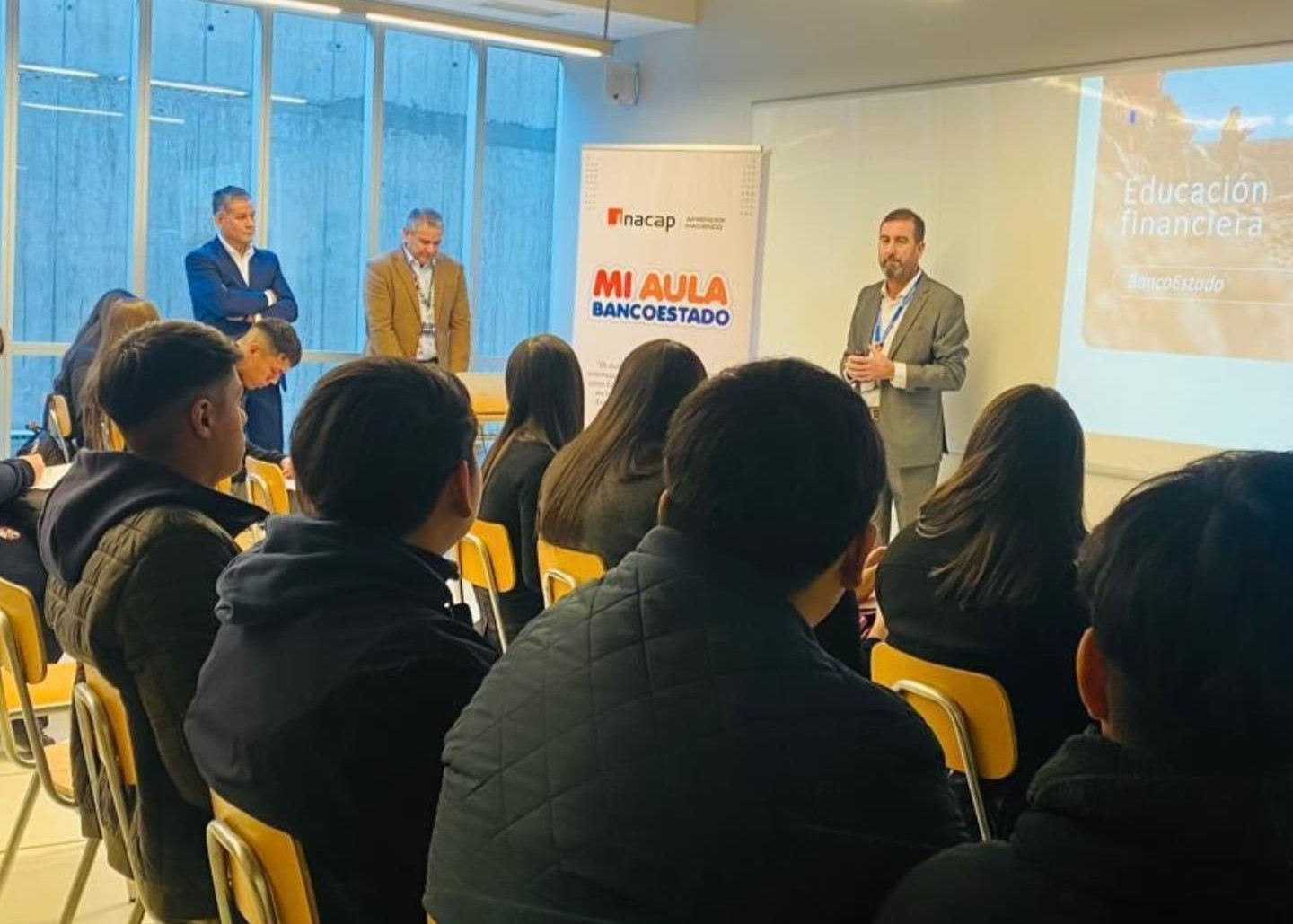 Estudiantes del 4° Medio C, de la Especialidad de Administración-Mención Recursos Humanos, Asisten a INACAP, Sede La Granja; para participar en “Mi Aula Banco Estado”, iniciativa orientada a fortalecer los aprendizajes en áreas de Educación financiera, Ciberseguridad en la educación financiera, Finanzas y Empleabilidad. Contribuyendo así a su formación profesional y personal.